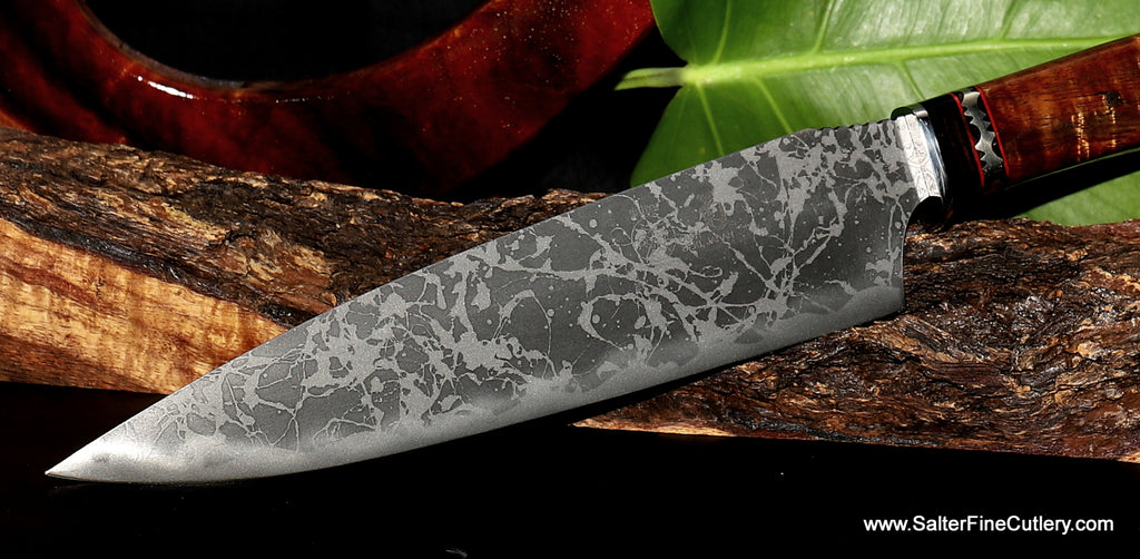 Our Limited Edition Combat Chef Series is one of our most exclusive chef or collectible knife blades available. This latest version is the MkII Limited Edition Collectible knife. There were and will only be 4 blades like this made by the famous Kiku Matsuda exclusively for Salter Fine Cutlery. They are true collectible items that will surely increase in value.