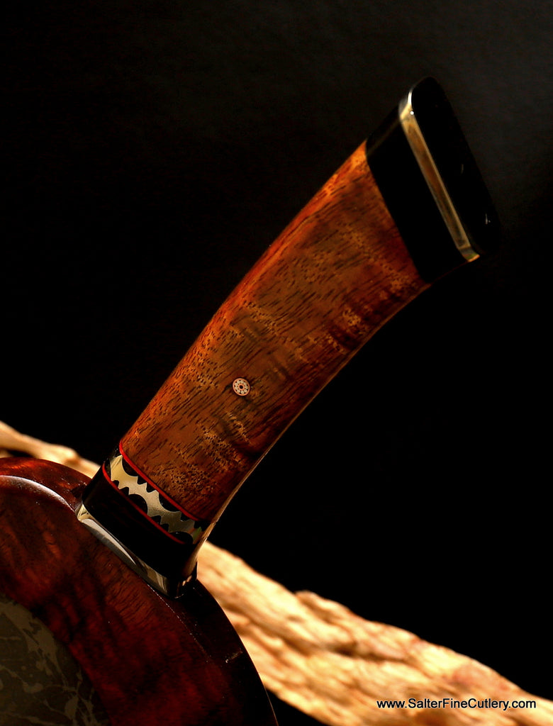 This one features a unique hand-filed decorative metal accent of nickel-silver, plus stainless steel bolster and additional decorative accent pieces of red, black Mozambique ebony and nickel-silver. The main body of the handle is very rare and curly Hawaiian koa wood.